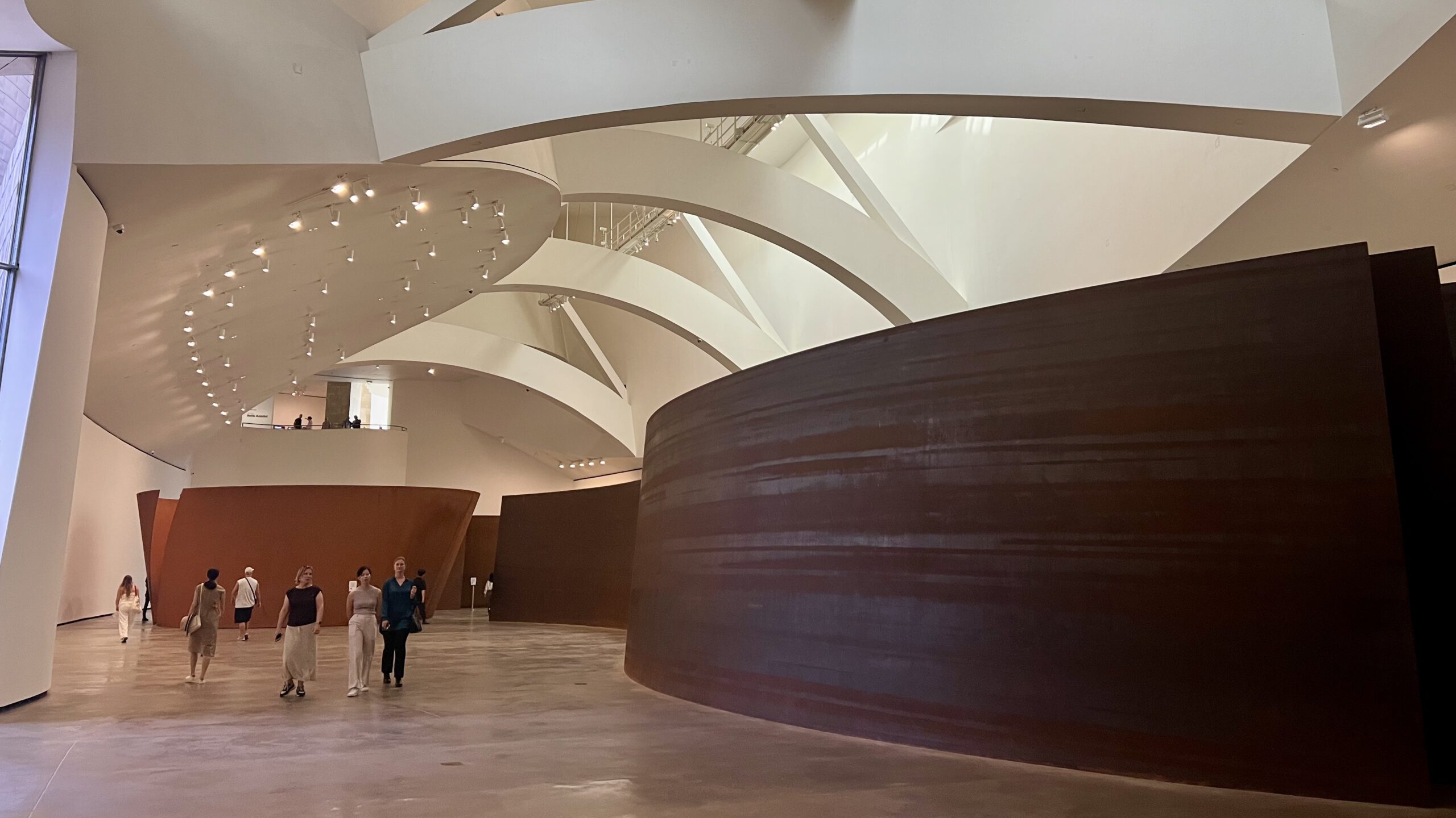 Stahl, Licht und Bewegung Das Guggenheim Museum in Bilbao ist ein Meisterwerk moderner Architektur und gleichzeitig ein Ort, an dem zeitgenössische Kunst in monumentaler Form erlebbar wird. Besonders beeindruckend sind die Stahlkonstruktionen der Hauptausstellung: titanbeschichtete Skulpturen und Installationen, die das Licht reflektieren, Räume durchdringen und in den Baukörper integriert sind. Der Künstler spielt mit Material, Gewicht und Bewegung, sodass die Werke fast lebendig wirken. Mich hat vor allem fasziniert, was mit der Stahlkonstruktionen für ein Raumwunder geschaffen wurde: Von außen wirkt es eher kompakt, doch ein langer Weg ins Innere eröffnet eine überraschende Dimension. Dort scheint sich der Raum zu vervielfachen, Wände, Licht und Skulpturen verbinden sich zu neuen Weiten, die einem ein Gefühl von Freiheit vermitteln. Der Bezug zur industriellen Geschichte Bilbaos wird durch fließende Formen und dynamische Linien in ein Gefühl von Leichtigkeit verwandelt. Die Ausstellung lädt ein, sowohl die Materie als auch die Idee dahinter zu betrachten: Wie Form, Struktur und Perspektive Emotionen hervorrufen und einen in ein visuelles und räumliches Erlebnis eintauchen lassen. Hier wird deutlich, dass Kunst nicht nur Darstellung, sondern aktives Gestalten von Raum, Licht und Wahrnehmung ist.