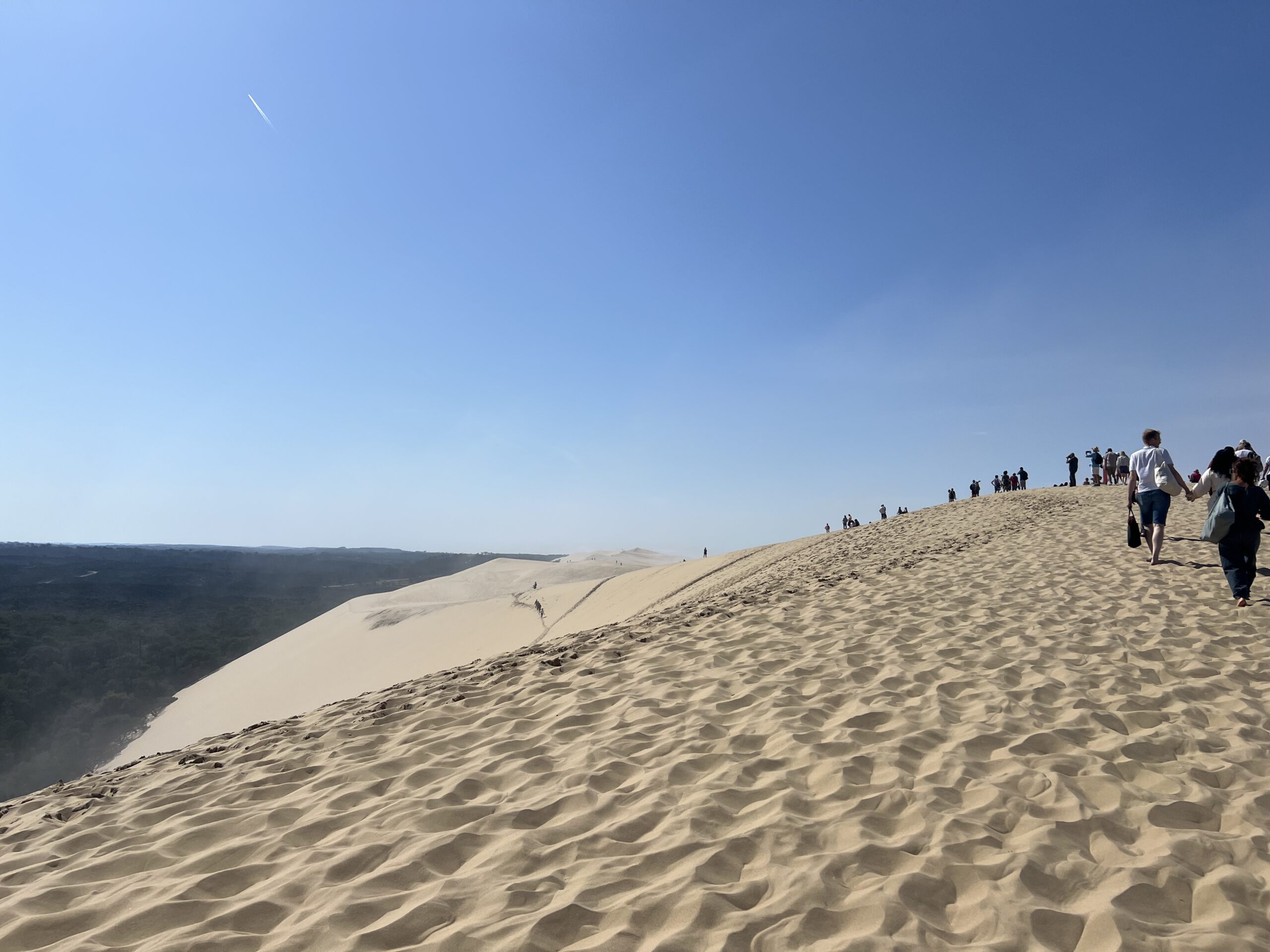 Die Natur als Künstlerin Die Dune de Pilat an der Atlantikküste Frankreichs ist ein lebendiges Kunstwerk der Natur. Jahr für Jahr transportiert der Wind Sand vom Meer und aus den angrenzenden Kiefernwäldern und fügt ihn Schicht um Schicht der Düne hinzu, sodass sie kontinuierlich wächst und sich ihre Form subtil verändert. Jeder Windstoß modelliert die Oberfläche neu, jede Bewegung des Sandes trägt dazu bei, dass die Düne wie ein lebendiges, ständig sich wandelndes Kunstwerk erscheint, das von den Kräften von Meer, Wind und Zeit geformt wird. Beim Besteigen der Düne wurde ich besonders von einem kurzen, gespenstischen Nebel beeindruckt, der plötzlich aufstieg und die Landschaft in mystisches Grau tauchte – und ebenso schnell wieder verschwand, sodass Sonne, Sand und Meer in einem Moment wieder in voller Klarheit erstrahlten. Dieses flüchtige Spiel von Licht, Farbe und Schatten verstärkte den Eindruck, dass die Düne lebt und sich selbst gestaltet. Jede Perspektive eröffnete neue Linien, Schatten und Lichtspiele, die den Blick fesselten und das Ausmaß der Düne noch beeindruckender erscheinen ließen. Die Dune de Pilat zeigt eindrucksvoll, dass die Natur selbst die größte Künstlerin ist: unplanbar, kraftvoll und zugleich von erhabener Schönheit, ein Monument, das sich ständig erneuert und doch unverändert majestätisch bleibt.
