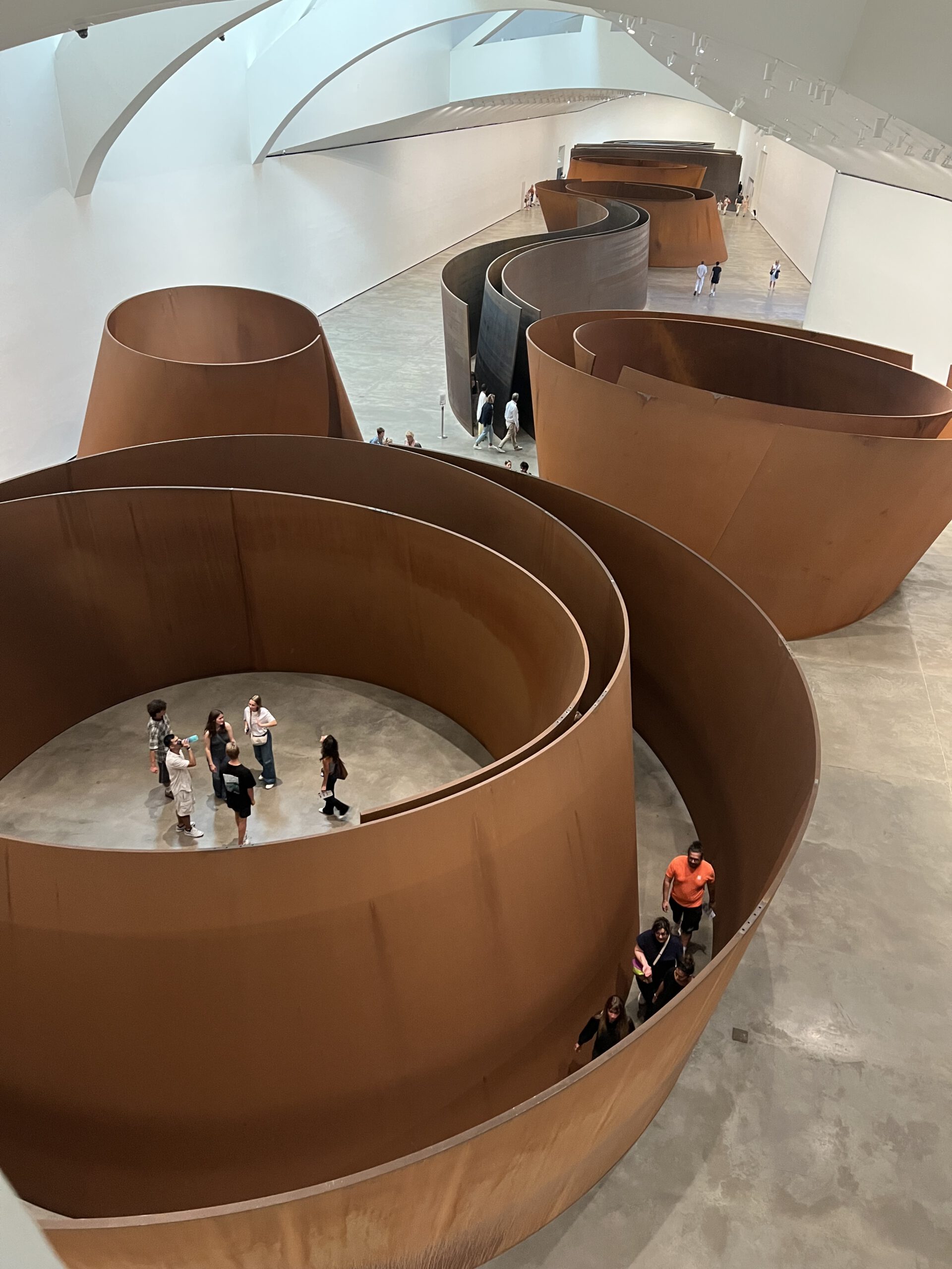 Stahl, Licht und Bewegung Das Guggenheim Museum in Bilbao ist ein Meisterwerk moderner Architektur und gleichzeitig ein Ort, an dem zeitgenössische Kunst in monumentaler Form erlebbar wird. Besonders beeindruckend sind die Stahlkonstruktionen der Hauptausstellung: titanbeschichtete Skulpturen und Installationen, die das Licht reflektieren, Räume durchdringen und in den Baukörper integriert sind. Der Künstler spielt mit Material, Gewicht und Bewegung, sodass die Werke fast lebendig wirken. Mich hat vor allem fasziniert, was mit der Stahlkonstruktionen für ein Raumwunder geschaffen wurde: Von außen wirkt es eher kompakt, doch ein langer Weg ins Innere eröffnet eine überraschende Dimension. Dort scheint sich der Raum zu vervielfachen, Wände, Licht und Skulpturen verbinden sich zu neuen Weiten, die einem ein Gefühl von Freiheit vermitteln. Der Bezug zur industriellen Geschichte Bilbaos wird durch fließende Formen und dynamische Linien in ein Gefühl von Leichtigkeit verwandelt. Die Ausstellung lädt ein, sowohl die Materie als auch die Idee dahinter zu betrachten: Wie Form, Struktur und Perspektive Emotionen hervorrufen und einen in ein visuelles und räumliches Erlebnis eintauchen lassen. Hier wird deutlich, dass Kunst nicht nur Darstellung, sondern aktives Gestalten von Raum, Licht und Wahrnehmung ist.